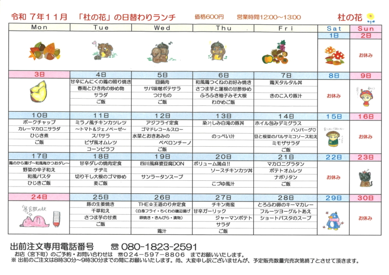 2025年11月の杜の花 🌰🍄 食堂ランチメニュー